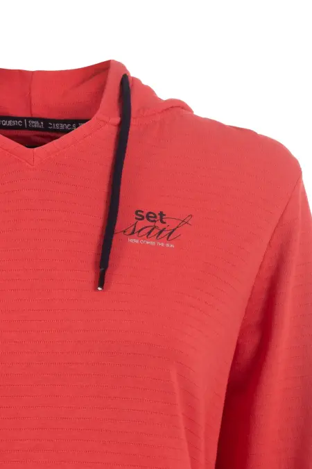 Das einzigartige Shirt mit Kapuze und Kordeln vereint einen lässigen Look mit hoher Detailverliebtheit. Neben der Kapuze machen auch zarte Streifen in der Oberfläche das Shirt besonders. Ein kleiner Lettering-Print in Farbe der Kordeln rundet das Bild ab.
