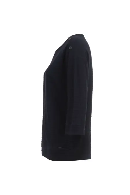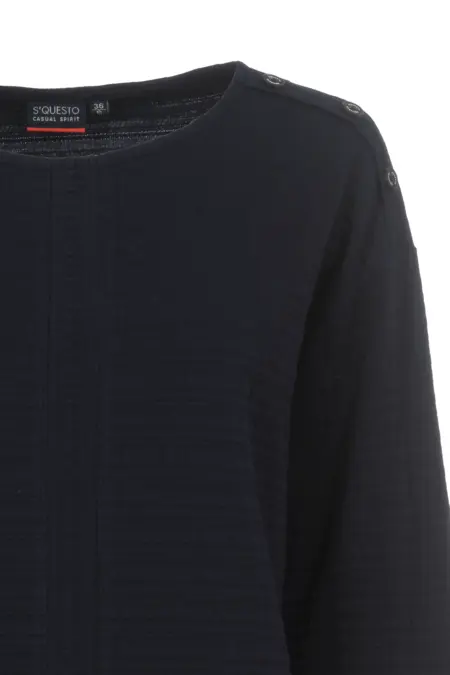 Das Shirt mit Rundhalsausschnitt und leicht überschnittener Schulter zeichnet sich durch die Strukturware aus. Durch Teilungsnähte und Knopfdetails an der Schulter wird der Look abgerundet.