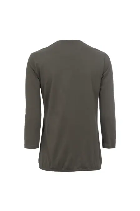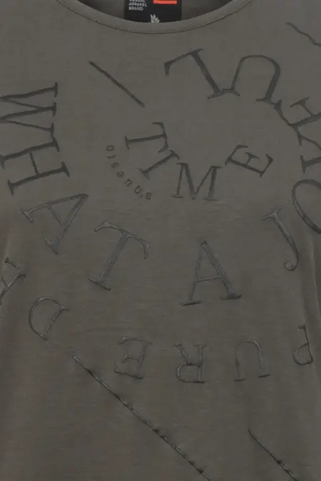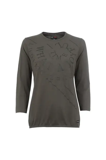 Baumwollshirt mit Rundhalsausschnitt und 3/4-Arm. Dem unifarbene Shirt wird der letzte Schliff durch einen großflächigen Lettering-Print in tonalen Farben verliehen.