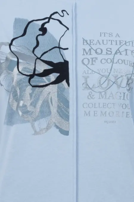 Feminines T-Shirt mit angenehmem 3/4-Arm und Rundhalsausschnitt. Ein verspieltes Detail ist die mittige Ziernaht mit dem geteilten, feminin gestalteten Print.