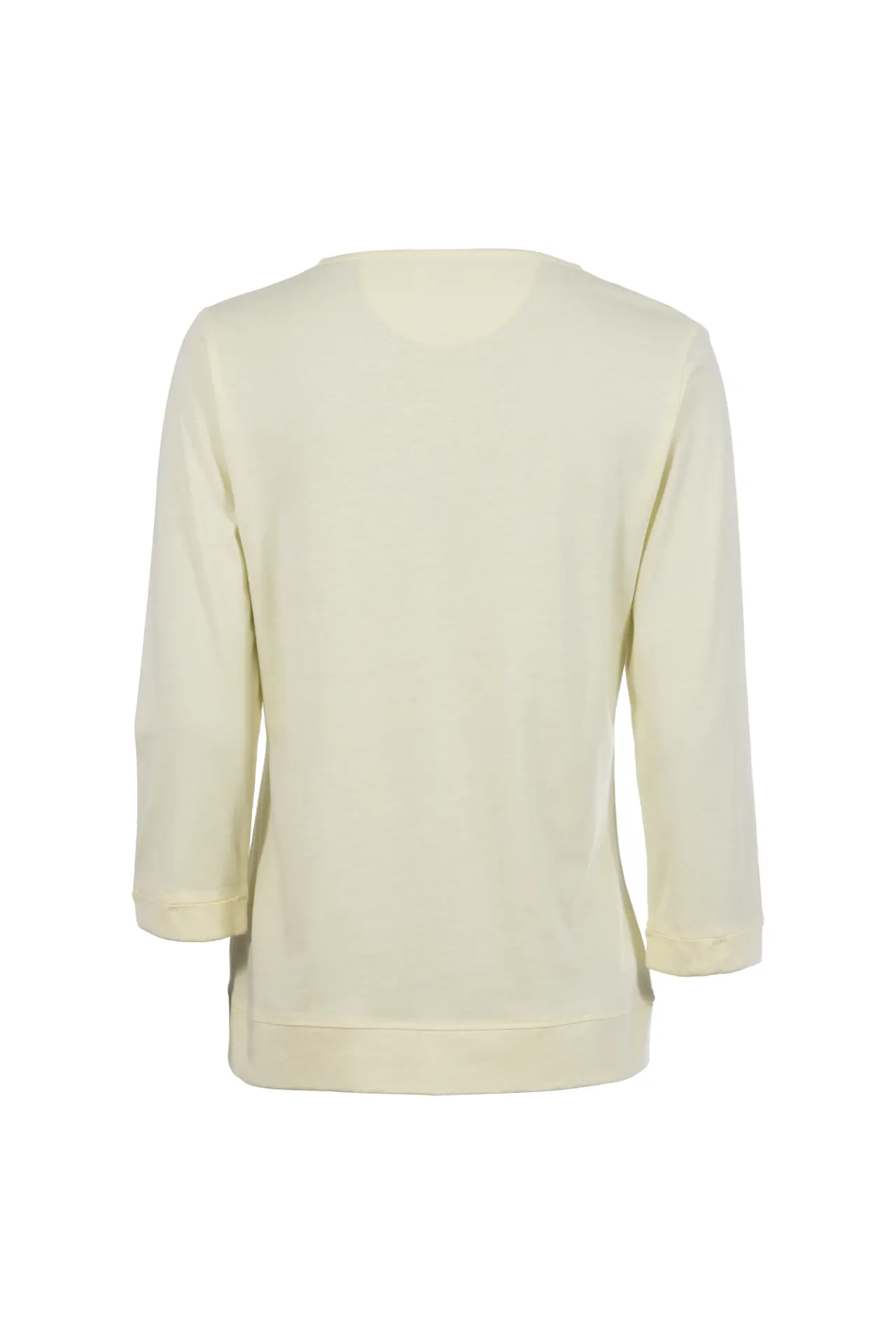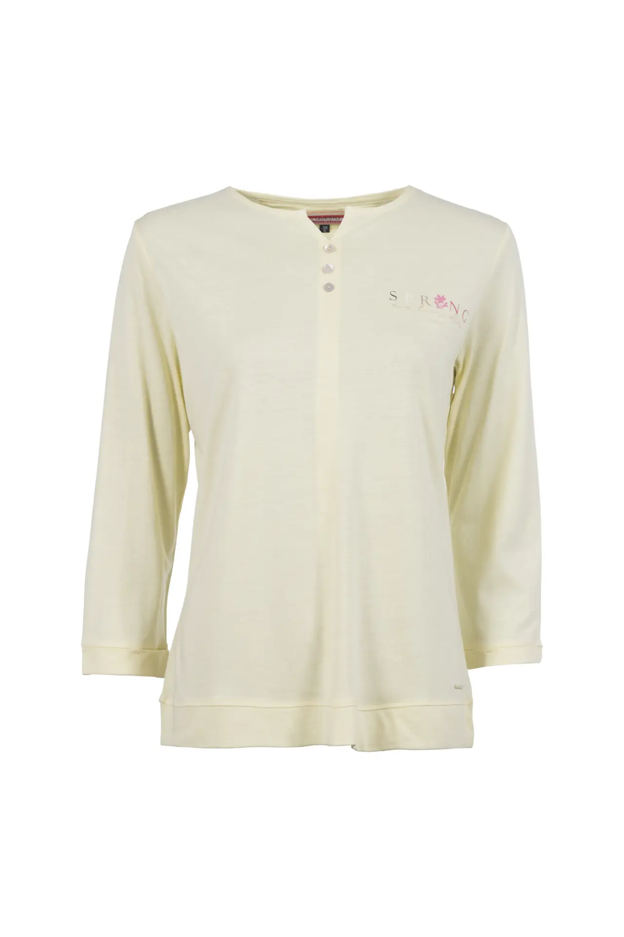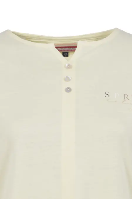 Dieses feminine Shirt besticht durch liebevolle Details: Kleine, verspielte Knöpfe am Ausschnitt setzen einen charmanten Akzent, während der filigrane Lettering-Print in frühlingshaften Farben auf der Brust für ein dezentes Highlight sorgt.