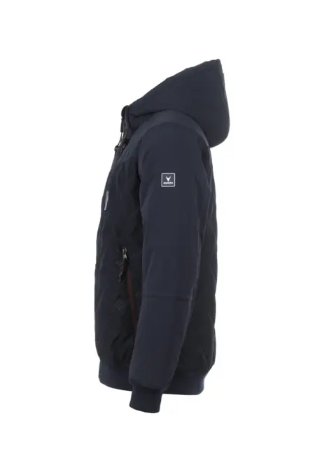Sportive Winterjacke mit Kapuze und Details in kontrastigem Rot. Die Jacke verfügt über zwei praktische Reißverschlusstaschen und eine Brusttasche. Das Zusammenspiel von glatter und strukturierter Ware wirkt sehr modern.