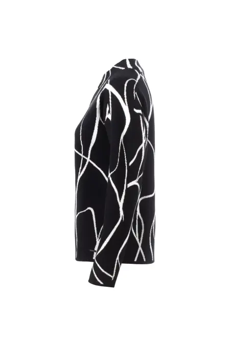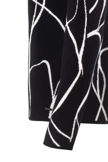 Sportive Strickjacke mit überschnittener Schulter, Reißverschluss und Stehkragen. Die Jacke zeichnet sich durch das grafische Allover-Muster in Schwarz und Weiß aus.