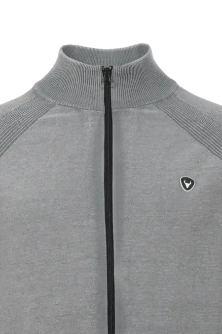 Unifarbene, gewaschene Strickjacke mit Stehkragen und Frontreißverschluss. Die Jacke verfügt über zwei praktische seitliche Eingriffstaschen.