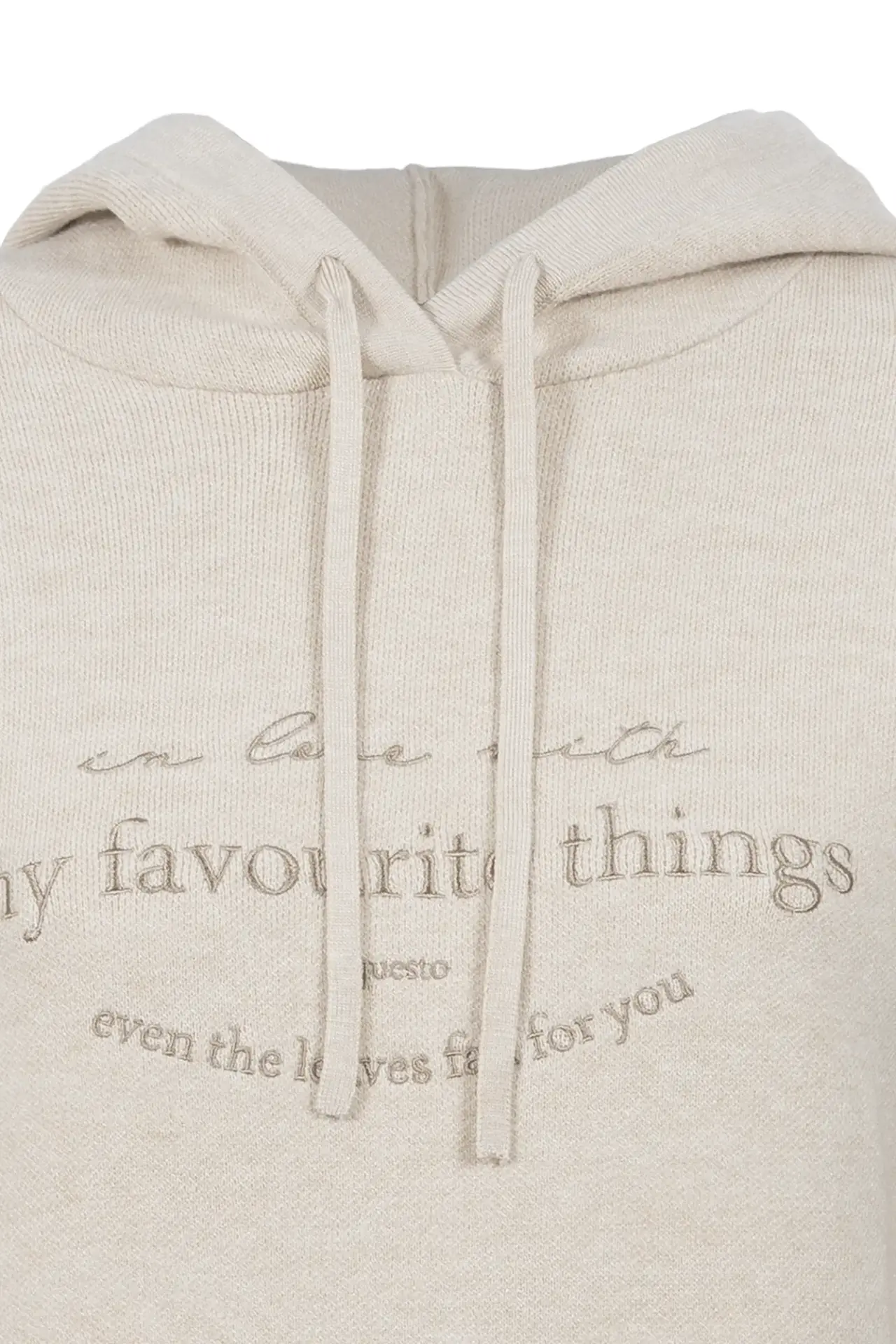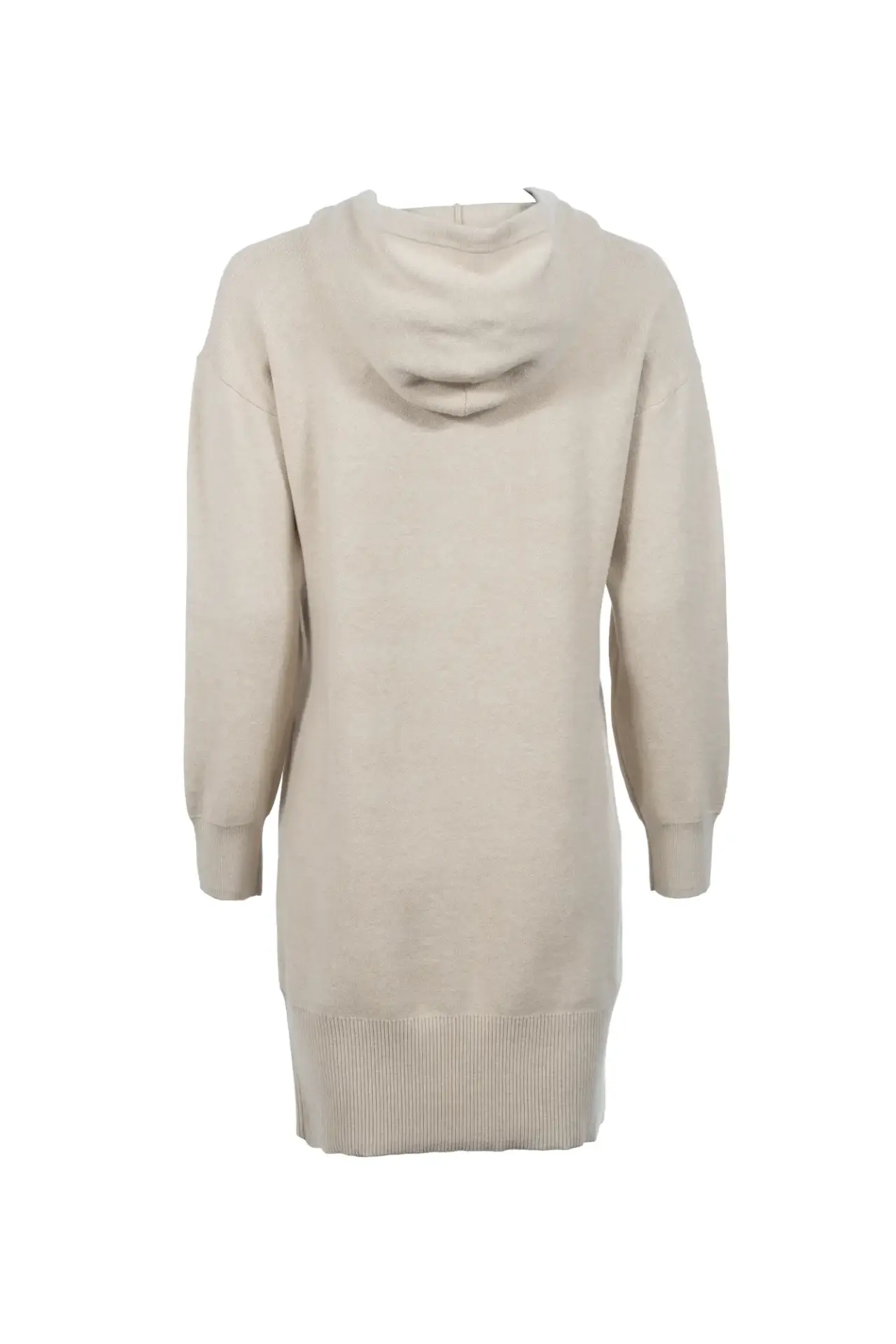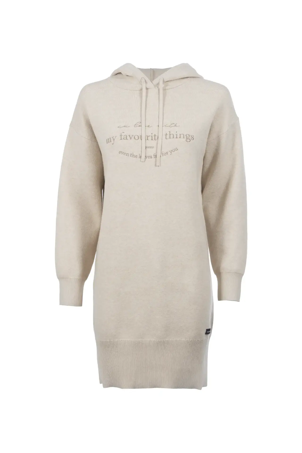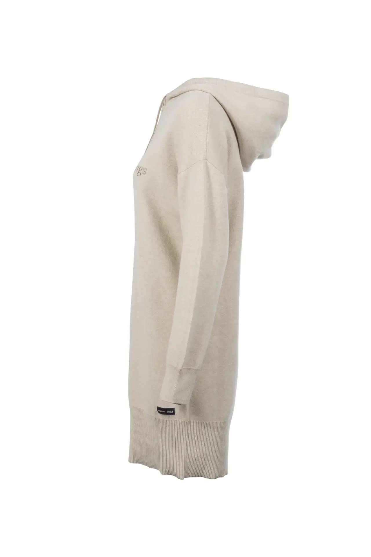 Das komfortable Strickkleid zeichnet sich durch eine Kapuze mit Kordeln aus. Mit filigraner Lettering-Stickerei auf der Brust. Überschnittene Schultern und gerippte Abschlüsse runden das Design lässig ab.