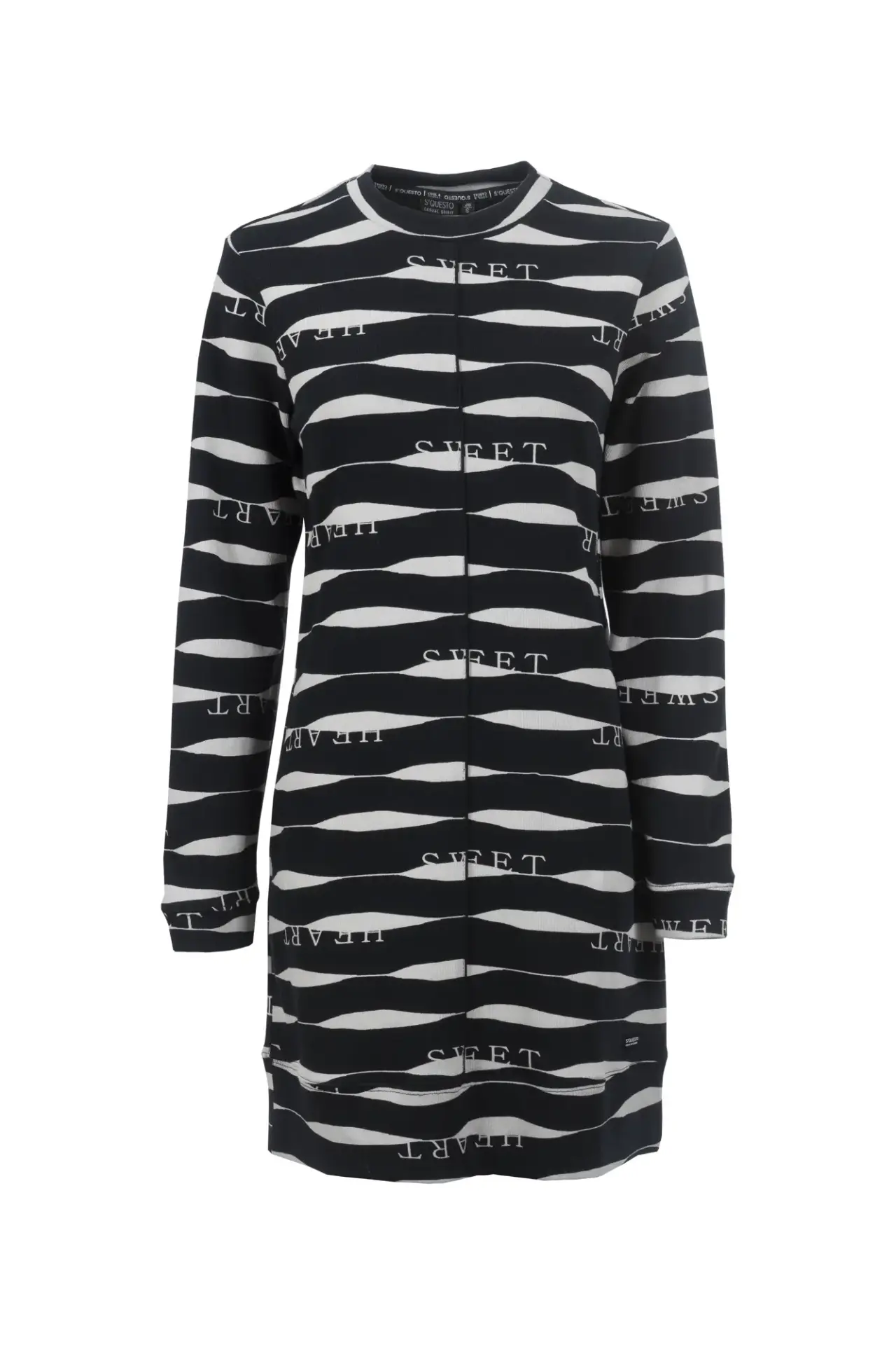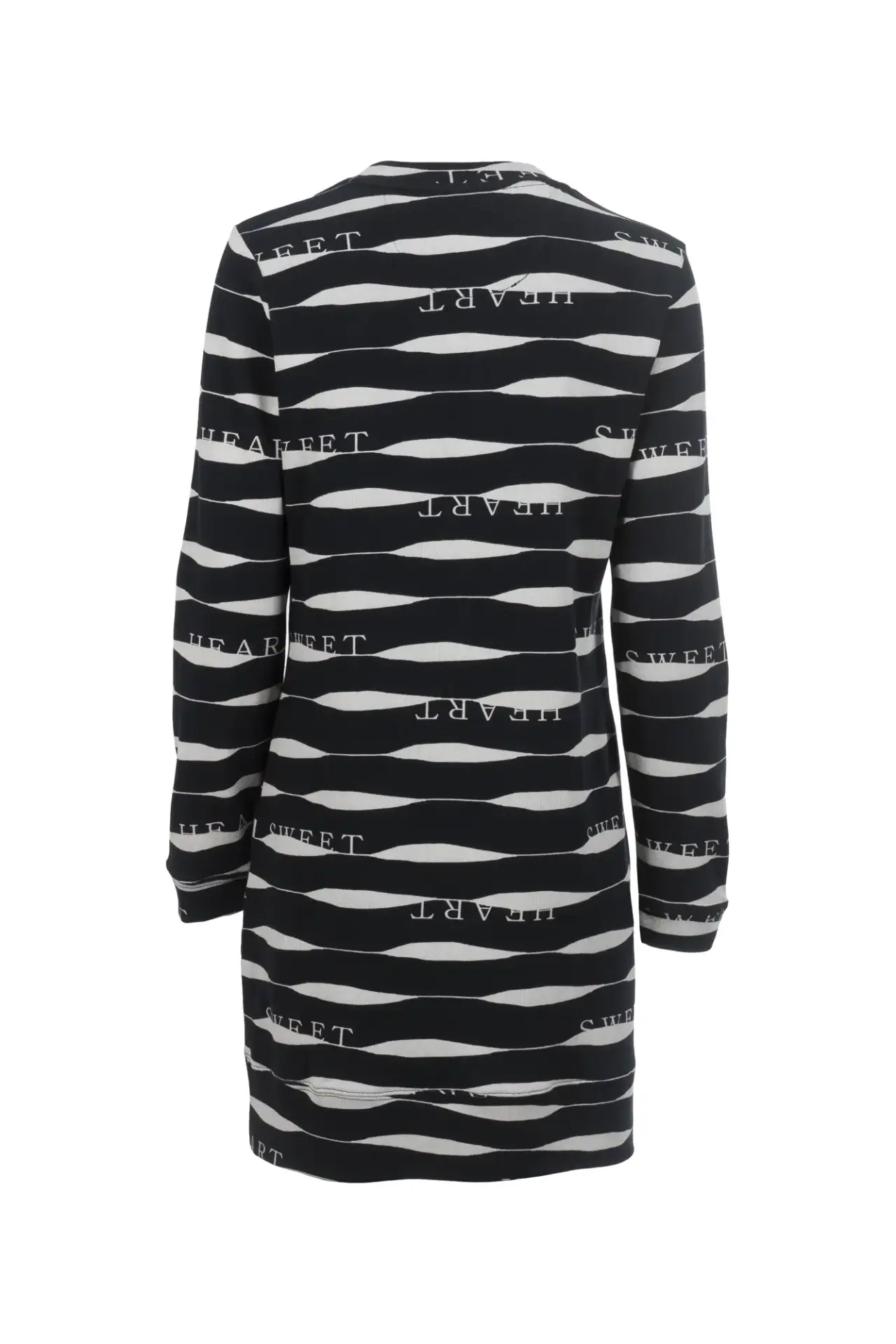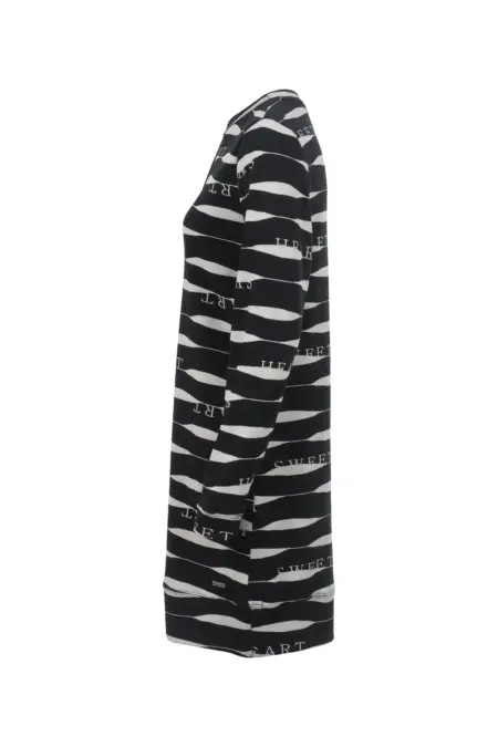 Feminines Strickkleid mit grafischem Allover-Muster mit Lettering-Elementen. Der lockere Schnitt verspricht optimalen Tragekomfort, während du trotzdem modisch gekleidet bist. Abgerundet durch eine mittige Ziernaht.