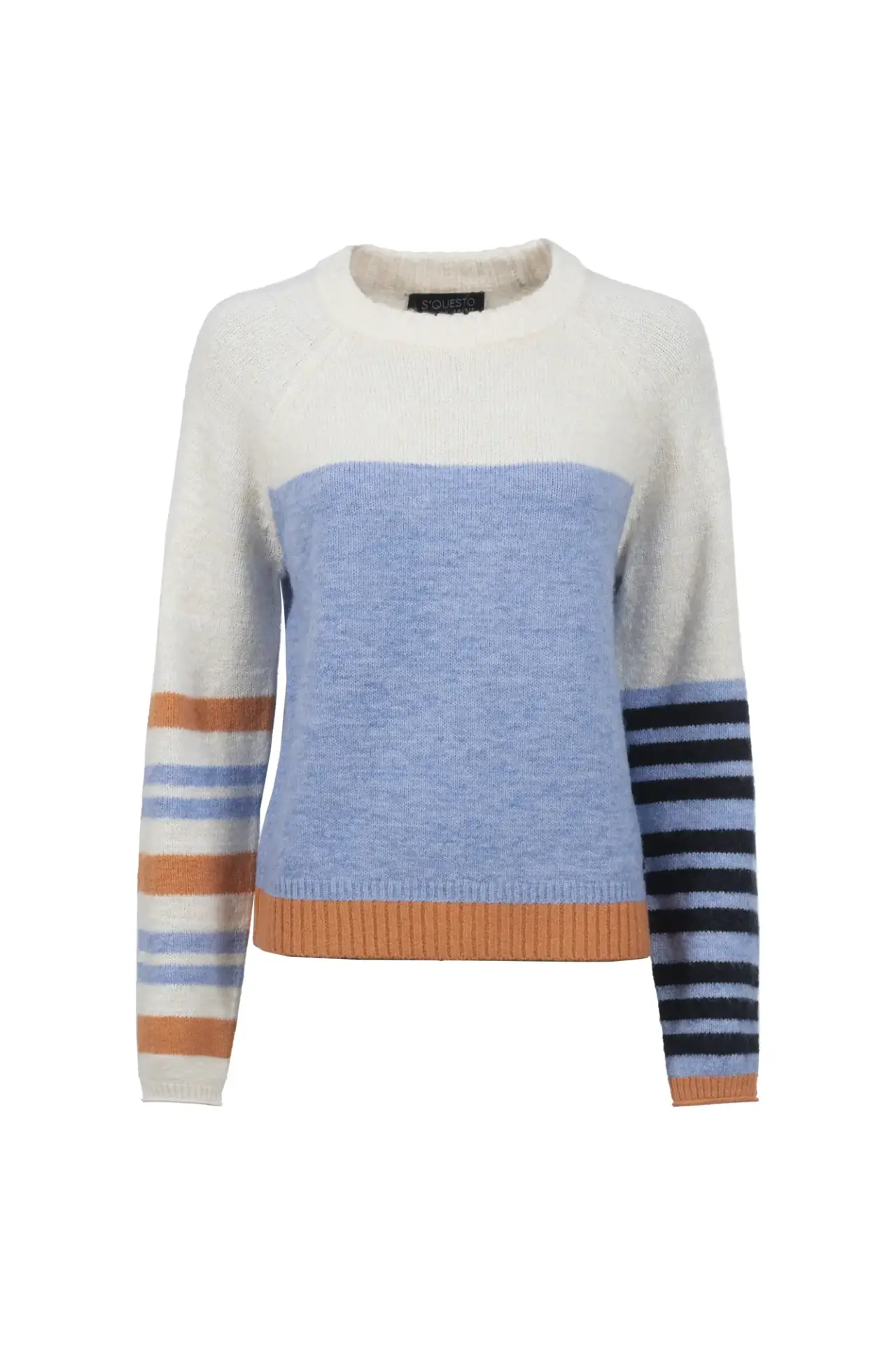 Verspielter Strickpullover mit außergewöhnlichem Streifendesign in harmonischer Farbkombi.