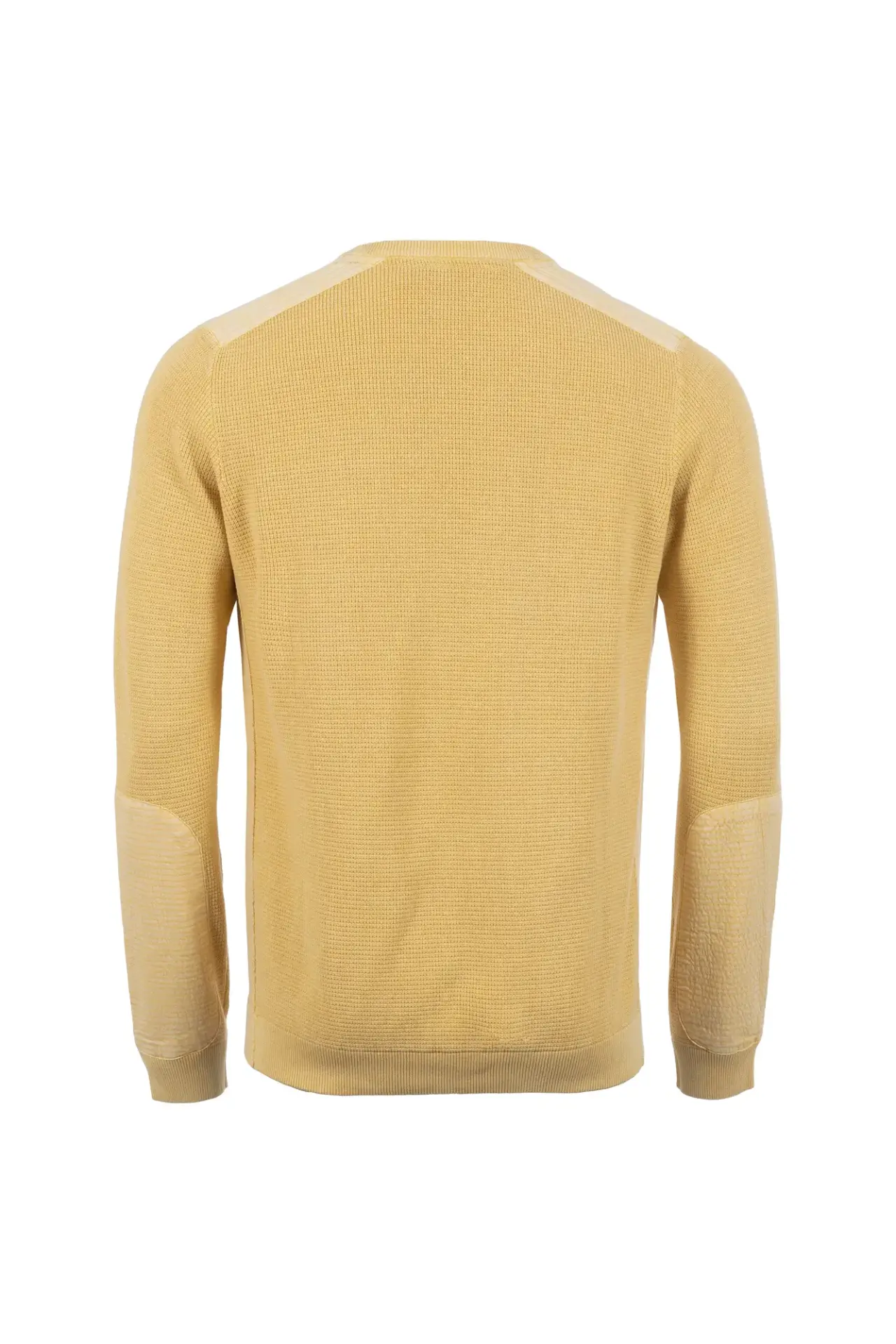 Leichter Strickpullover mit klassischem Rundhalsausschnitt. Webeinsätze an Schultern und Ärmeln sorgen für Struktur, während die aufgesetzte Brusttasche mit Print dem Look eine lässige Note verleiht.