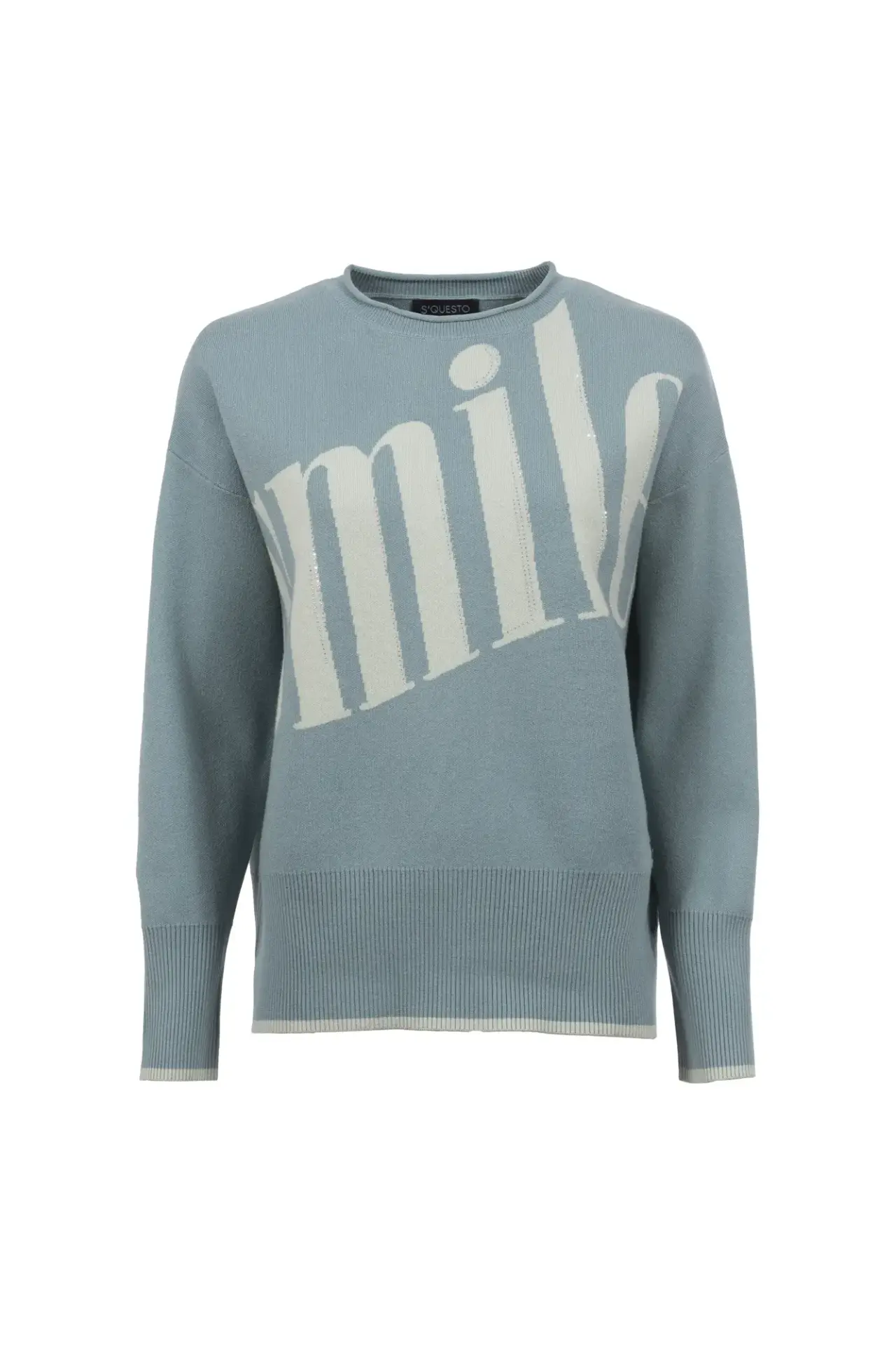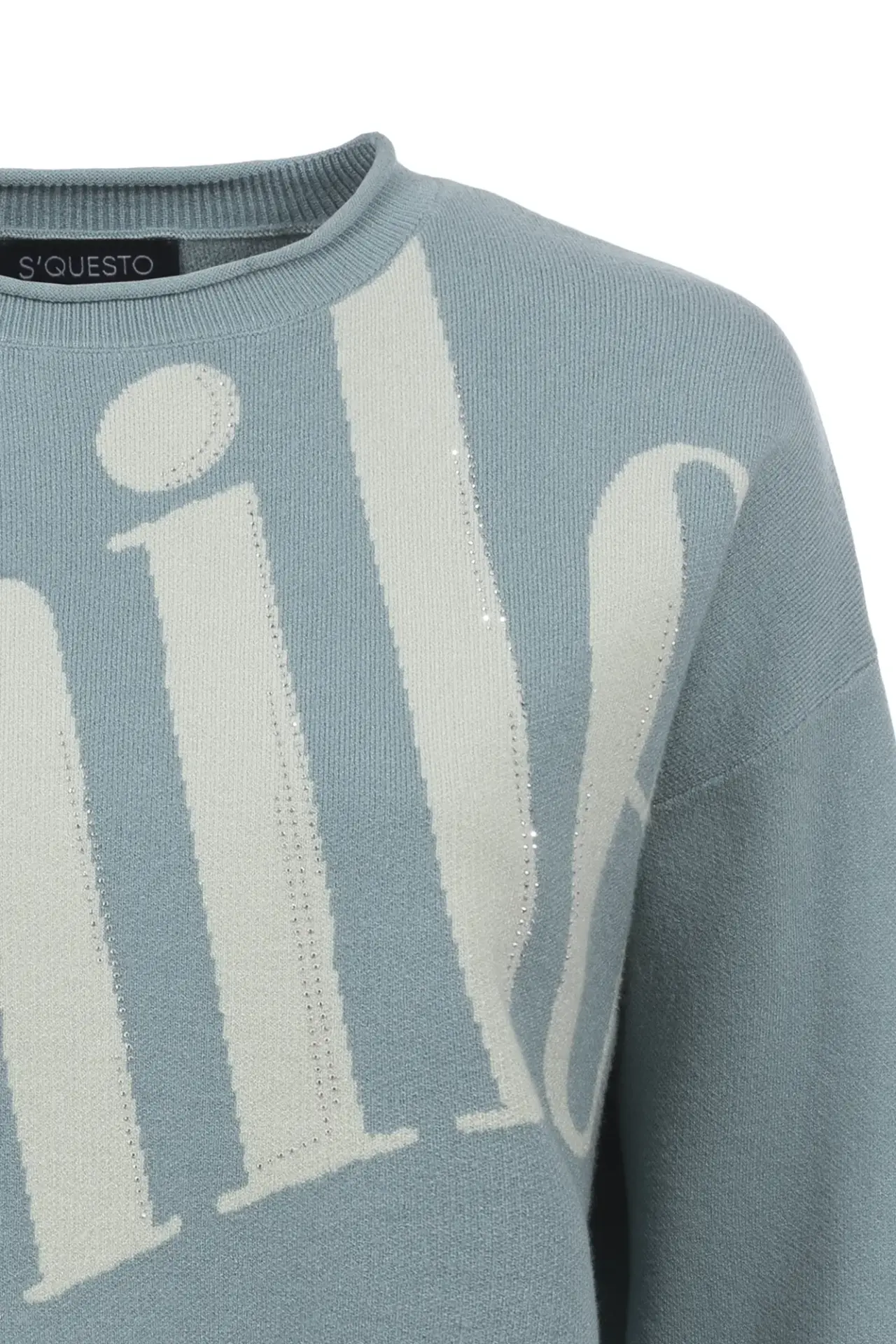 Hochwertiger Strickpullover mit lässigem Schnitt. Der modische Schriftzug auf der Brust wird durch dezente Glitzersteine aufgepeppt. Abgerundet durch eine farblich passende Kante an den breiten Rippabschlüssen.