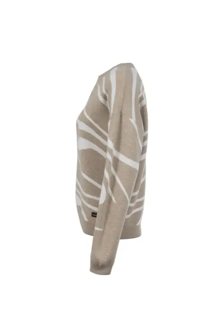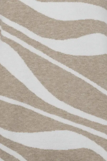 Feinstrick Pullover mit hohem Rundhalsausschnitt in tollem Sand melange. Auf der Vorderseite wird mit einem modernen Linienmuster gespielt. Perfekt kombiniert mit dem passenden S’questo Strickrock.
