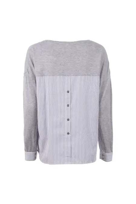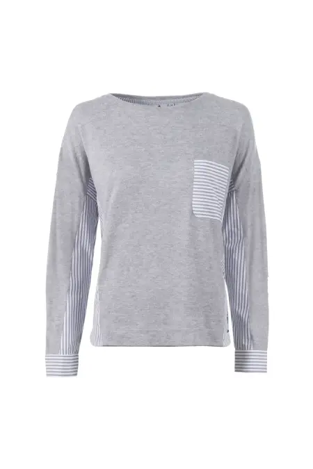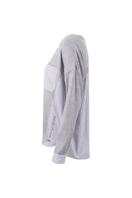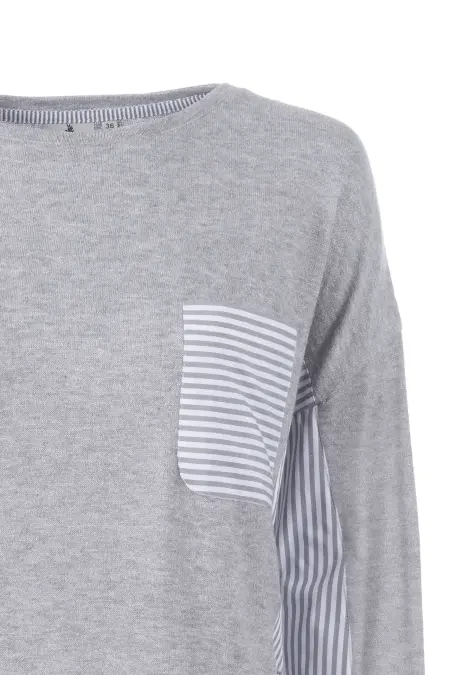 Mix&Match-Pullover aus leichtem Strick und zart gestreifetem Blusenstoff. Auf der Vorderseite bildet eine Tasche aus dem Blusenstoff einen schönen Kontrast. Abgerundet wird der einzigartige Style durch zarte Knöpfe am Rücken.