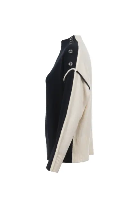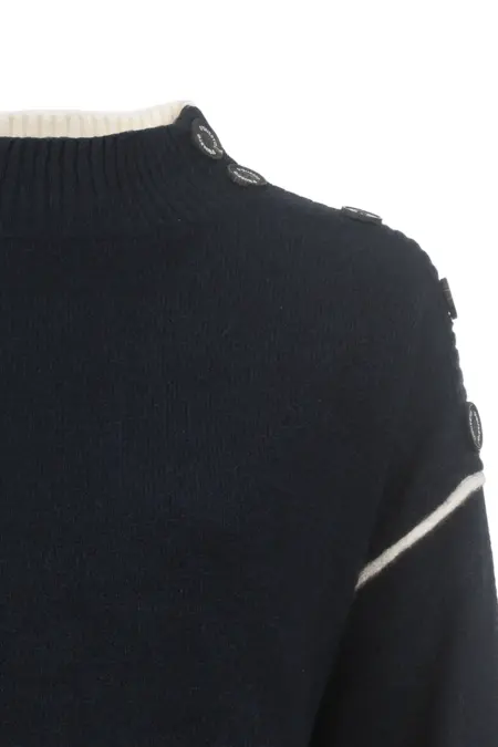 Der weiche Strickpullover überzeugt durch farbliche Kontraste in Navy und Offwhite und durch die Knopfleiste am Stehkragen.