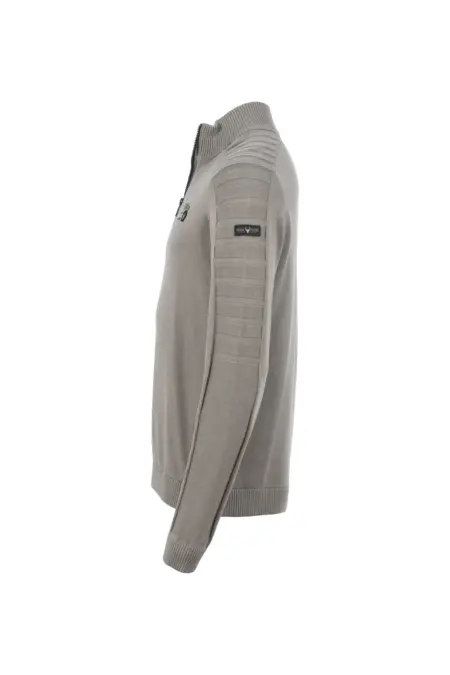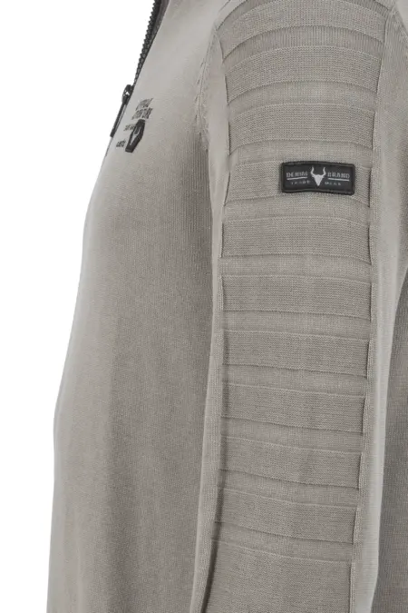 Stilvoller Strickpullover mit Stehkragen und Reißverschluss. Die spannende Struktur auf den Ärmeln hebt den Pullover ab. Ein kleiner Lettering-Print auf der Brust und hochwertige Questo-Patches werten den Look auf.