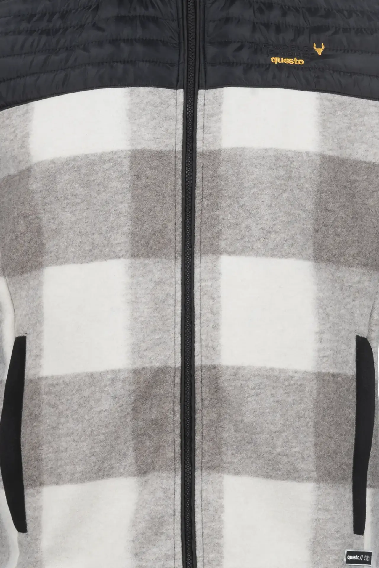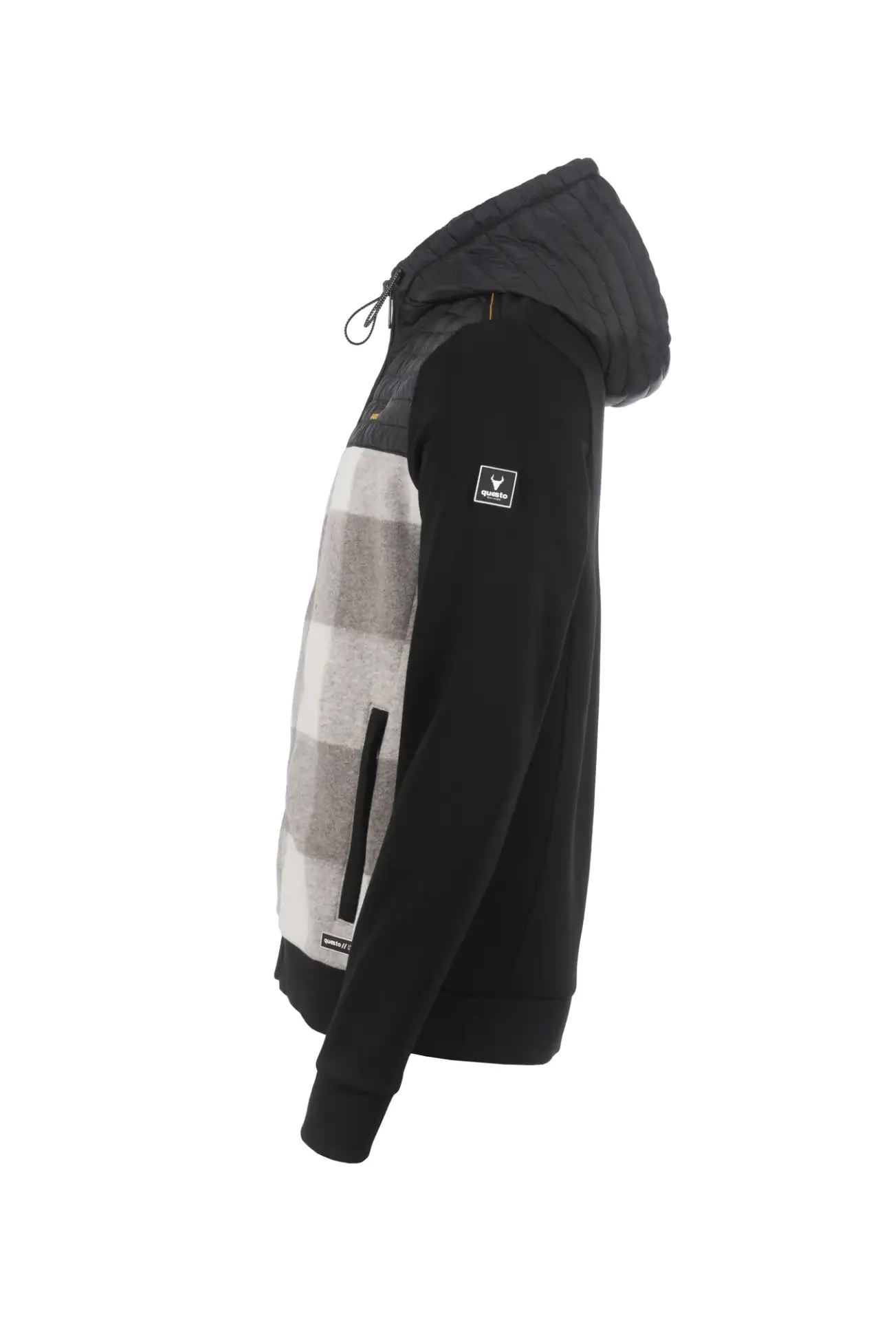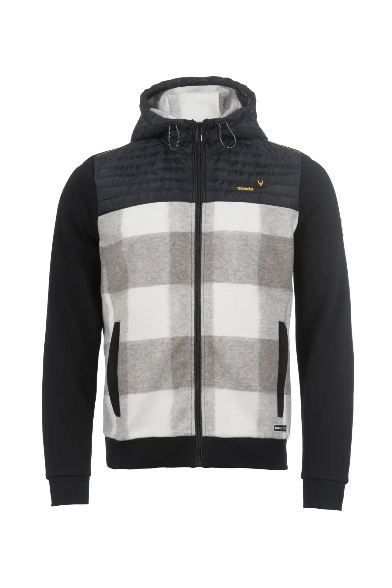 Diese modische Sweatjacke kombiniert kariertes Material in Wolloptik mit gestepptem Webstoff für einen markanten Look mit Struktur. Die Kapuze und dezente Farbakzente runden das Design ab.