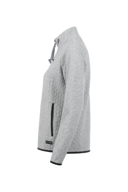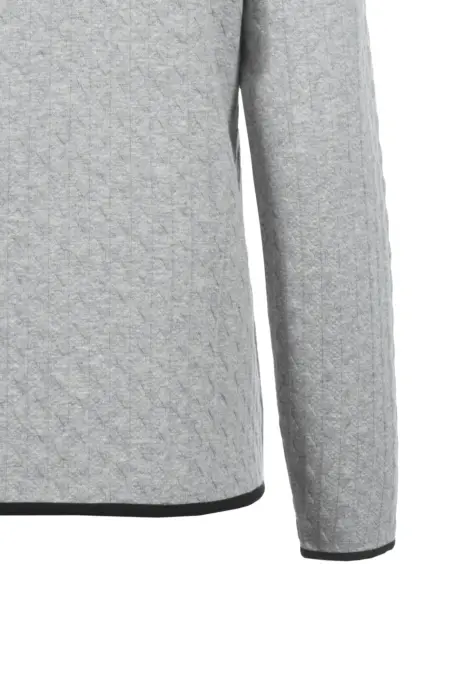Unifarbene Sweatjacke mit spannender Jacquard-Struktur. Mit sportivem Stehkragen und Bändern. Besonders sticht die Jacke heraus durch die Kontrastkanten an den Ärmelenden und Taschen.