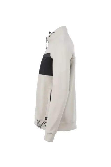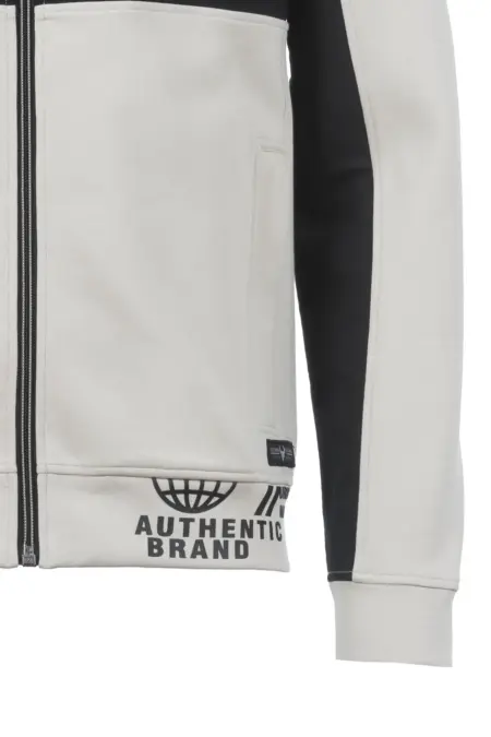 Sportive Sweatjacke mit Stehkragen. Die Brustpartie und Ärmelinnenseiten sind mit schwarzen Webeinsätzen abgesetzt, auf denen sich ein tonaler Questo-Print befindet.