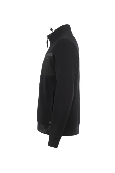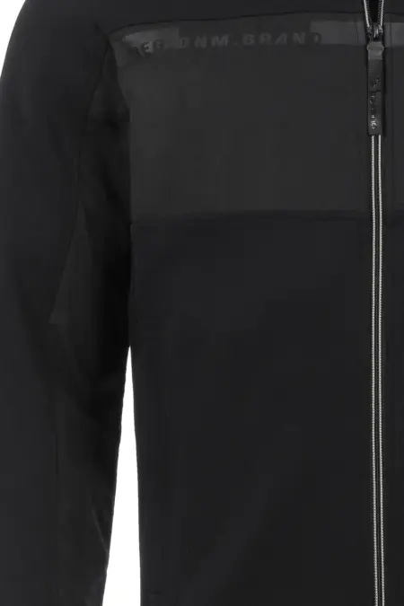 Sportive Sweatjacke mit Stehkragen. Die Brustpartie und Ärmelinnenseiten sind mit schwarzen Webeinsätzen abgesetzt, auf denen sich ein tonaler Questo-Print befindet.