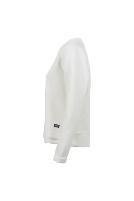 Hochwertiges, unifarbenes Jacquard-Sweatshirt mit grafischem Muster. In klassischem Rundhalsausschnitt mit breitem Bund und kleinen seitlichen Schlitzen für den femininen Touch.