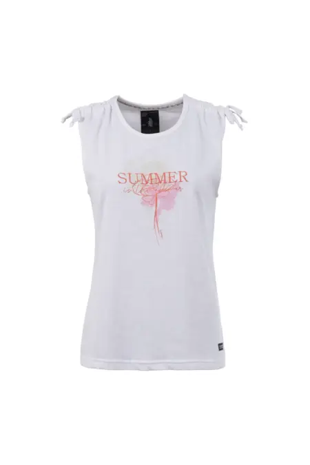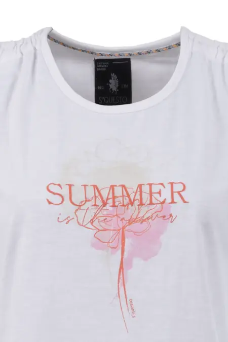 Feminines Top mit sommerlichem Frontprint in Kontrastfarbe. Die Raffungen mit Schleife an den Schultern runden den Look perfekt ab und ein sommerliches, verspieltes Outfit entsteht.