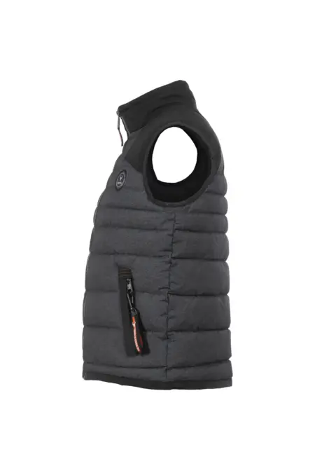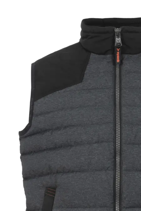 Stehkragen Steppweste in melierter Optik. Die Schulterpartie und der Kragen sind mit Nyloneinsätzen abgesetzt. Die praktischen Seitentaschen sind mit Reißverschlüssen zu verschließen.