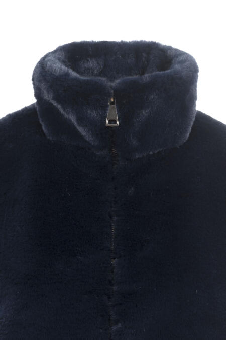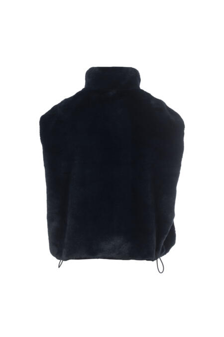 Modische Fake-Fur Weste mit Stehkragen. Die Weste sitzt besonders lässig und kann durch einen Gummizug am Bund individuell angepasst werden. In klassischem Navy oder zartem Grau erhältlich.