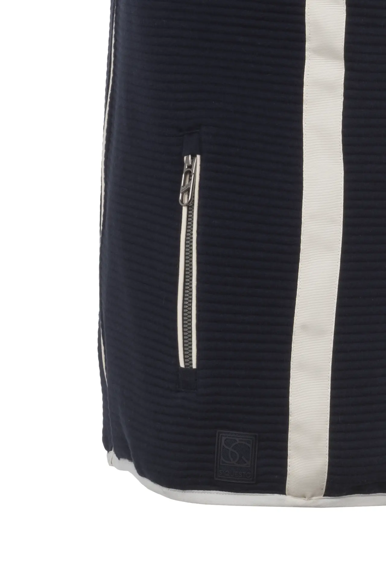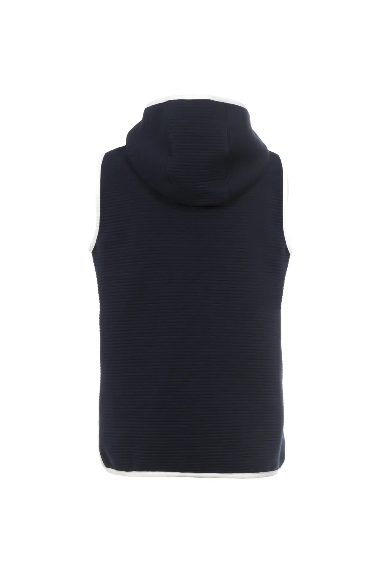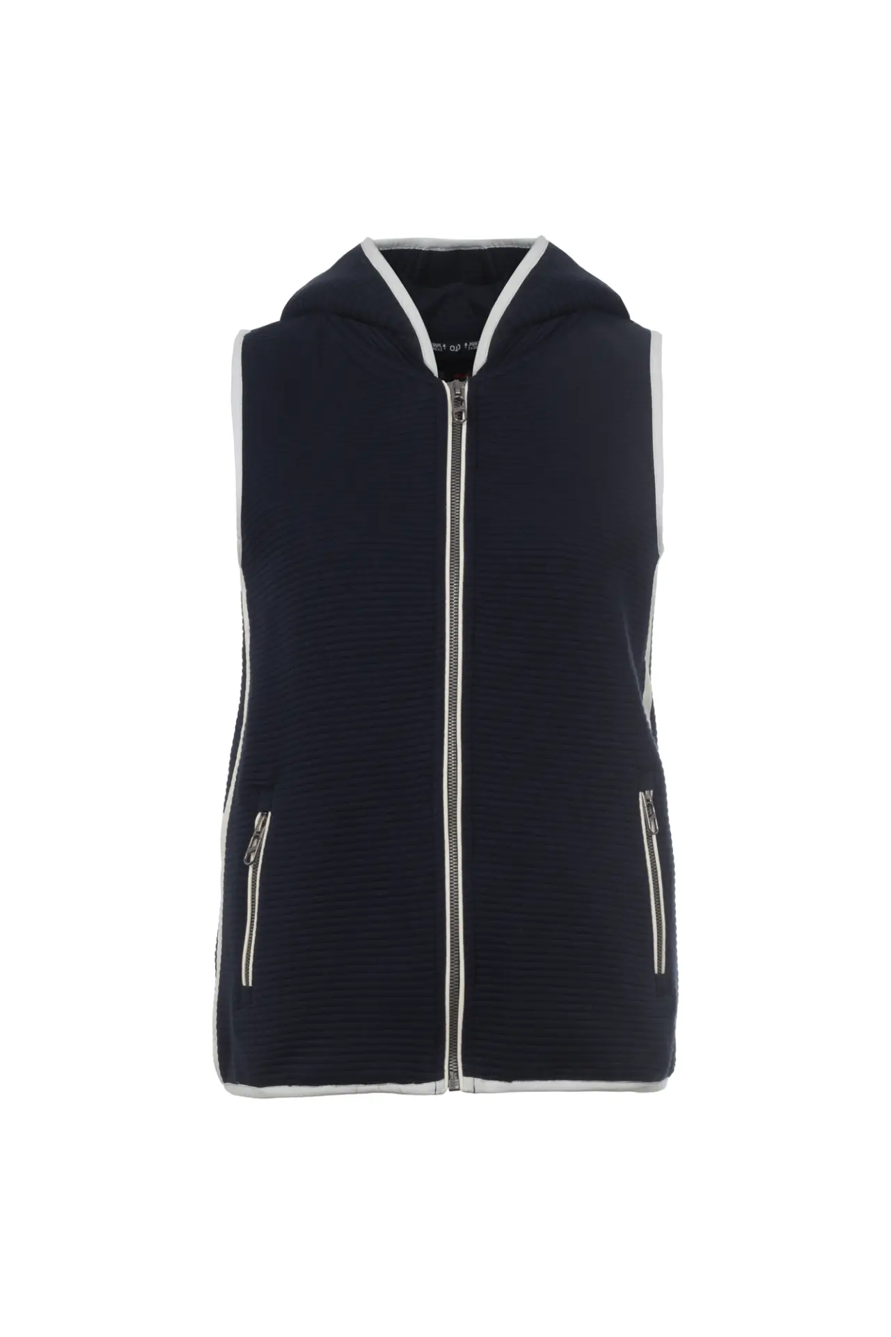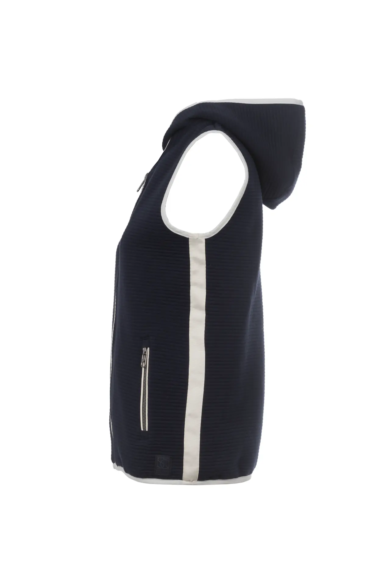 Leichte Weste in tonaler Streifenstruktur. Die Kapuze und Kontrastpipings erzeugen einen sportiven Look. Die Weste hat zwei Taschen.